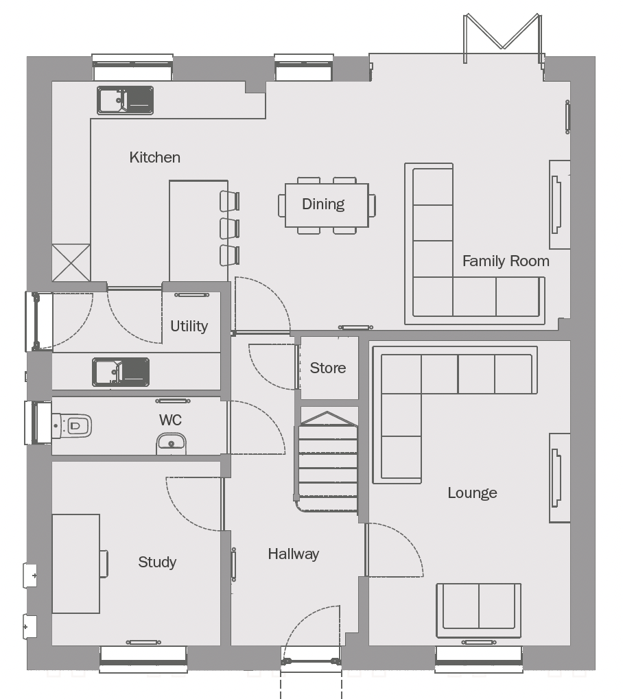 A central hallway opens up this double fronted property leading immediately into the spacious living room, study, and cloakroom. At the rear of the property is a large open plan space including a modern kitchen with breakfast bar, plus dining and family area, with bifold doors leading to the rear garden. The ground floor is completed with a utility room and storage cupboard.